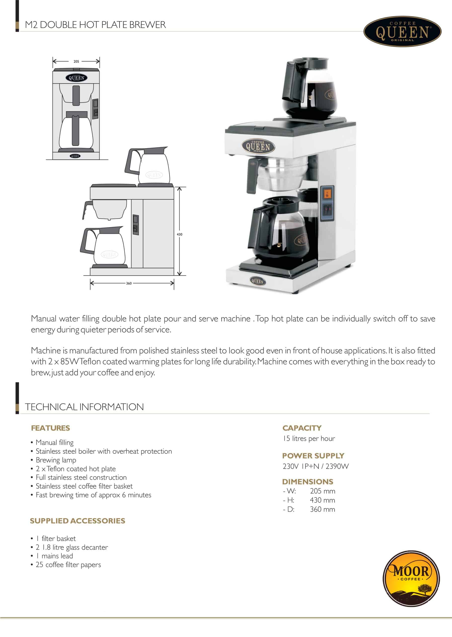 Lastly, invest in the Coffee Queen M2 Filter Coffee Machine for unmatched professional filter coffee service with exceptional build quality. Not only does it feature robust stainless steel construction designed for demanding commercial use, but the dual hot plate system also ensures continuous coffee availability for busy establishments. Therefore, it’s an ideal choice for businesses seeking reliable, high-capacity filter coffee brewing with professional presentation. Additionally, the comprehensive supplied accessories and straightforward operation make this machine perfect for establishments requiring immediate professional coffee service capability.